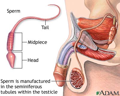 The male reproductive system creates sperm that is manufactured in the seminiferous tubules within each testicle. The head of the sperm contains the DNA, which when combined with the egg's DNA, will create a new individual. The tip of the sperm head is the portion called the acrosome, which enables the sperm to penetrate the egg. The midpiece contains the mitochondria which supplies the energy the tail needs to move. The tail moves with whip-like movements back and forth to propel the sperm towards the egg. The sperm have to reach the uterus and the fallopian tube in order to fertilize a woman's egg.