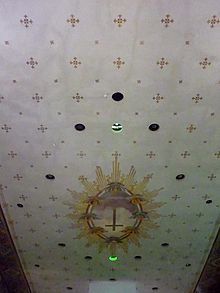 A ceiling painted in 1910 in the church of St Laurent in Grenoble has many swastikas. It can be visited today because the church became the archaeological museum of the city. A proposed direct link between it and a swastika floor mosaic in the Cathedral of Our Lady of Amiens, which was built on top of a pagan site at Amiens, France in the 13th century, is considered unlikely. The stole worn by a priest in the 1445 painting of the Seven Sacraments by Roger van der Weyden presents the swastika form simply as one way of depicting the cross. Swastikas also appear on the vestments on the effigy of Bishop William Edington (d. 1366) in Winchester Cathedral.